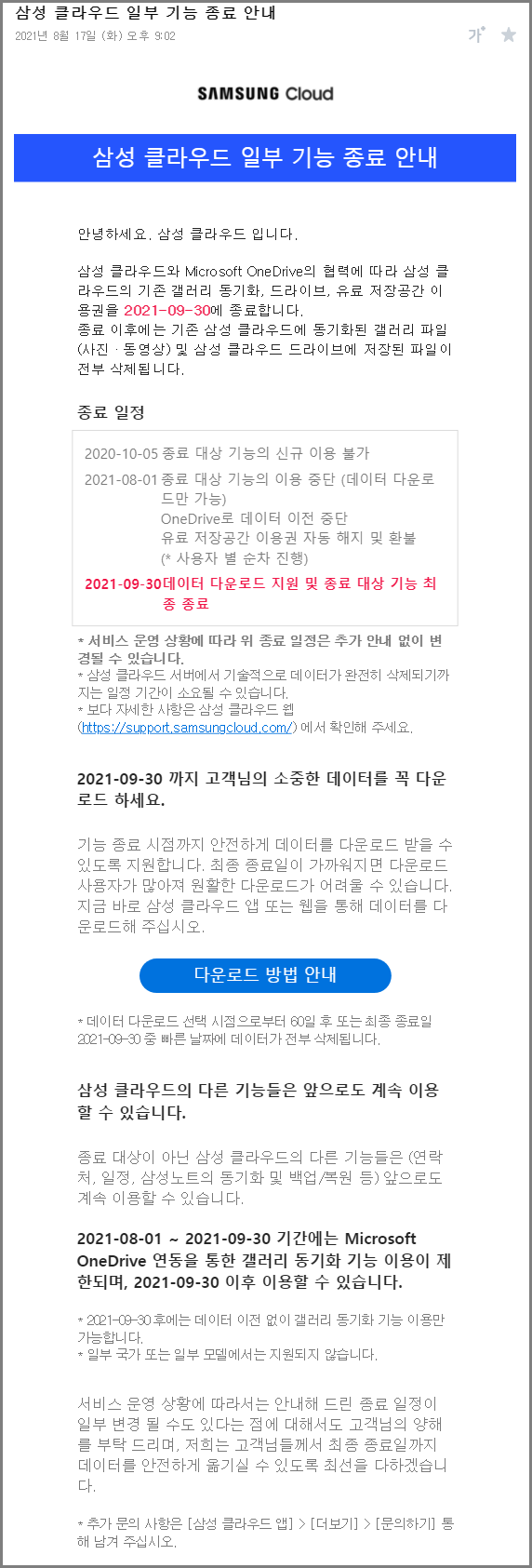 2021-09-30 까지 고객님의 소중한 데이터를 꼭 다운로드 하세요.* 서비스 운영