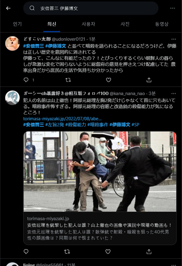 한편, 아베신조와 이토히로부미(또는 이등박문 *伊藤博文) 의 해시태그가 되어있다.