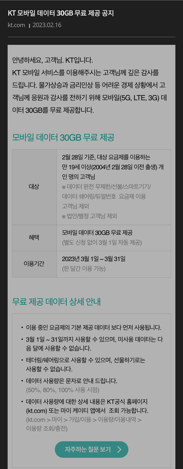 [KT 이동전화 데이터 30GB 무료 제공] 3월 데이터 30GB 무료 제공에 대해 알려주세요