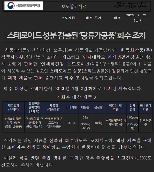 [보도참고] 스테로이드 성분 검출된 ‘당류가공품’ 회수 조치 스테로이드 성분 검출된 ‘당류가공품’ 회수 조치 첨부파일 첨부파일 전체 다운로드 --> 7.21 (보도참고) 식품관리총괄과.hwpx 다운
